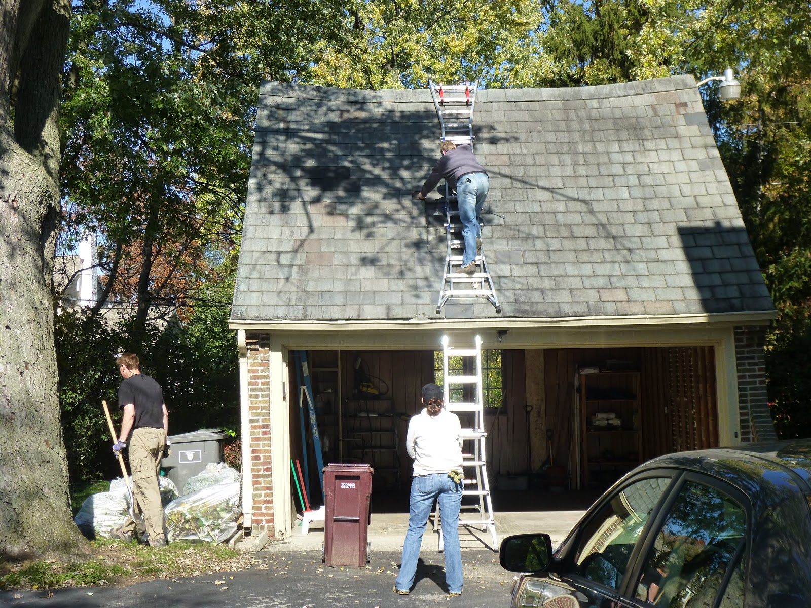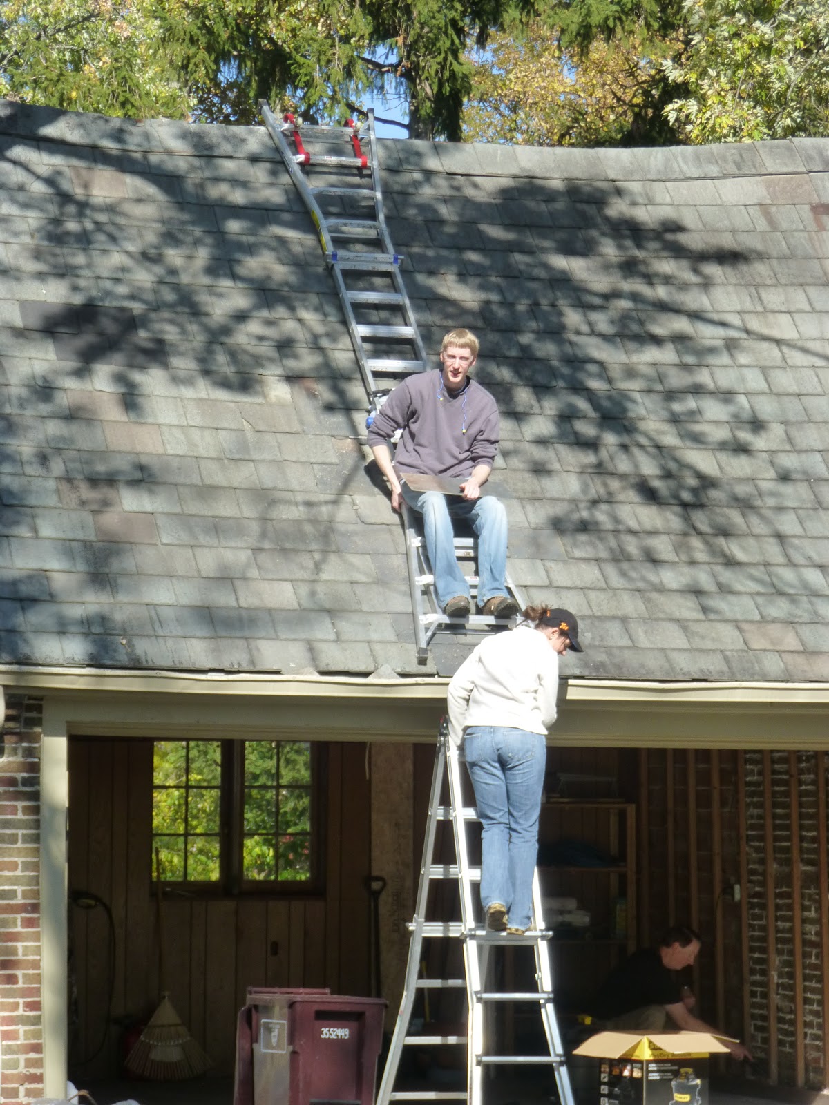 Steve and Lindsey have an older home with a slate roof . Steve had been planning to get some tiles fixed. Its very complicated to work on since you cant lay on the roof. He ordered a special ladder and hooks that can be hooked on the top of the roof. Doug helped him finagel the ladder to the correct position so Steve could get to work.